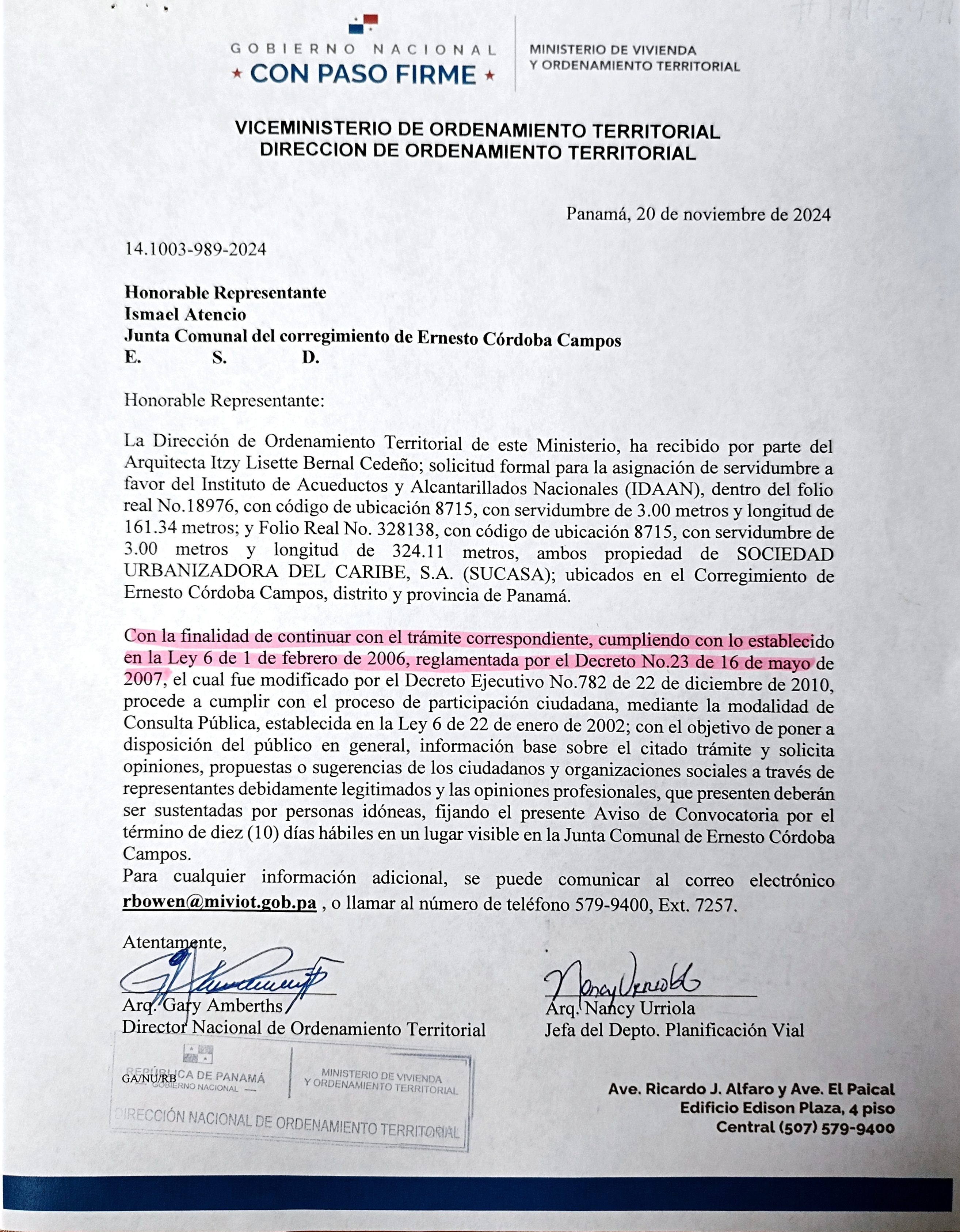 CONSULTA PÚBLICA - Asignación de servidumbre a favor del Instituto de Acueductos y Alcantarillados (IDAAN)